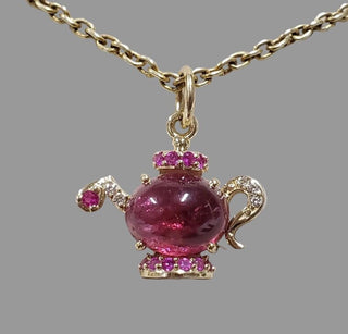 14k Gold Teapot Pendant: Pink Tourmaline Cabochon, Ruby & Diamond