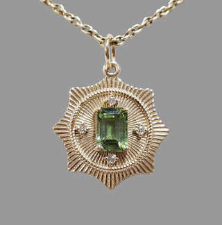 14k Gold Green Tourmaline Diamond Pendant, Art Deco Starburst Necklace