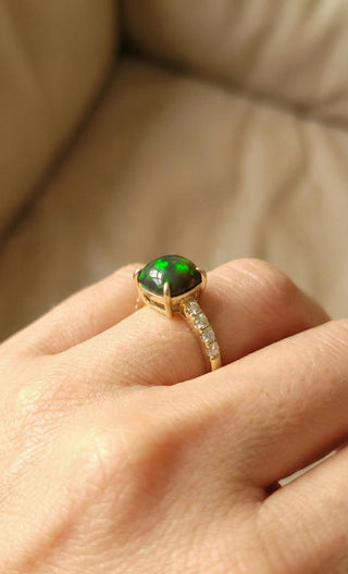 14K Gold Black Opal Diamond Ring • Cushion Cut Natural Black Opal