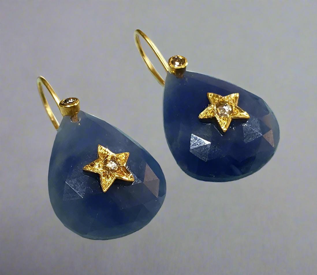 The large pear-shaped sapphires create a striking and luxurious appearance, while the diamond star detail adds a modern and celestial charm. These earrings are perfect for women who love statement jewelry that remains elegant and refined.