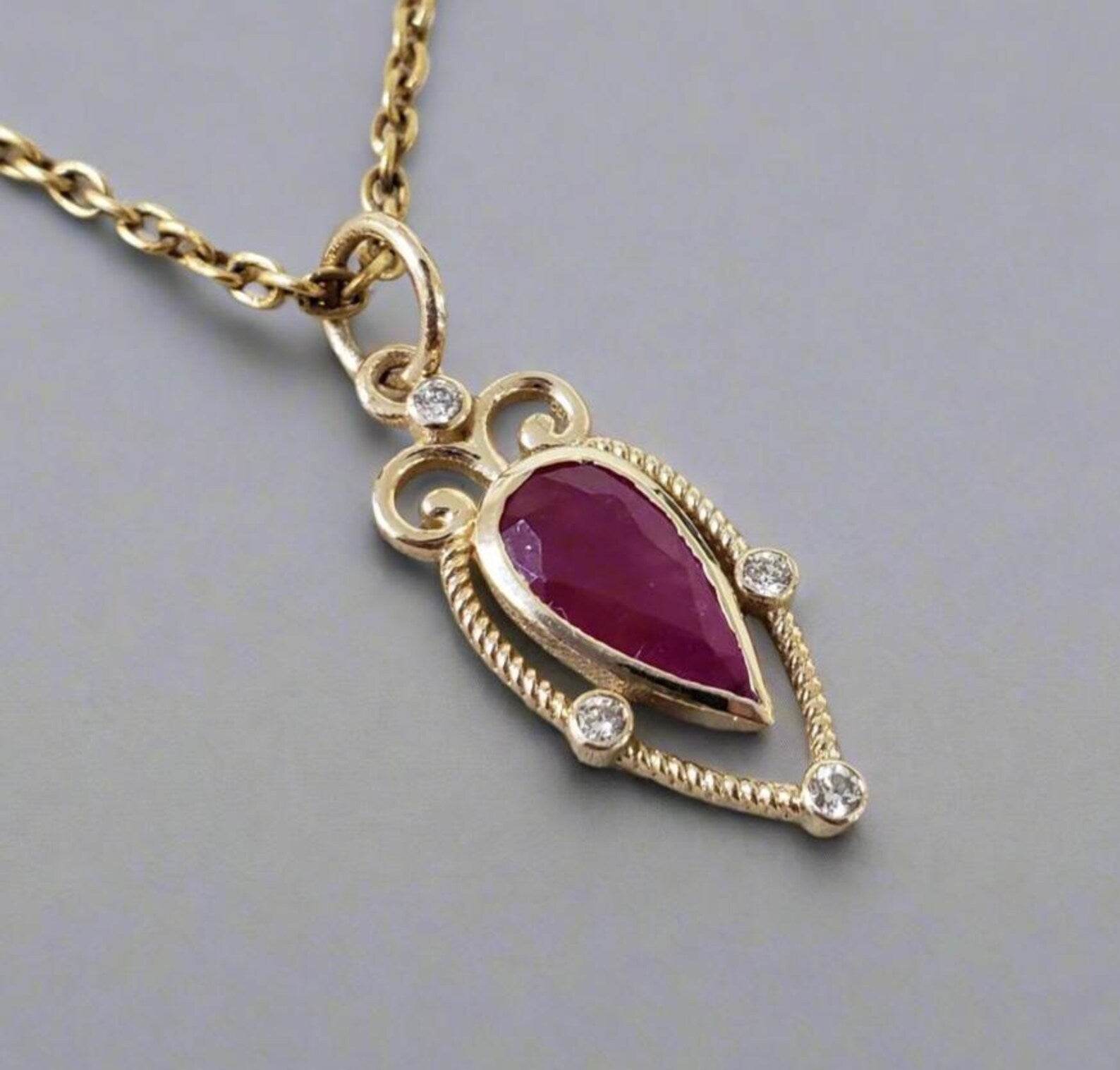 Every detail of this pendant highlights quality and beauty. With its unique teardrop ruby and refined craftsmanship, it is both stylish and durable.