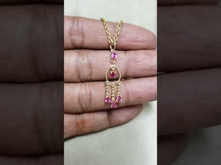 Whether you are looking for a luxurious accessory or a meaningful gift, this 14k gold ruby pendant stands out with its unique chandelier style and superior handmade finish.