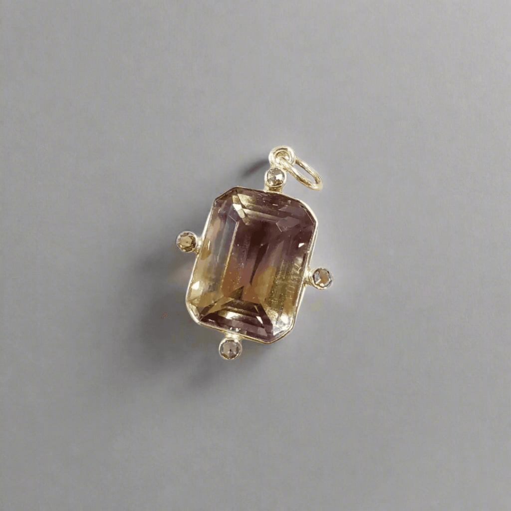 This dainty ametrine and diamond gold pendant is handmade with attention to detail. The octagon-cut ametrine reveals its natural blend of purple (amethyst) and golden-yellow (citrine), highlighted by sparkling rose-cut diamonds. A bezel setting secures the gemstones, making this piece both durable and luxurious.