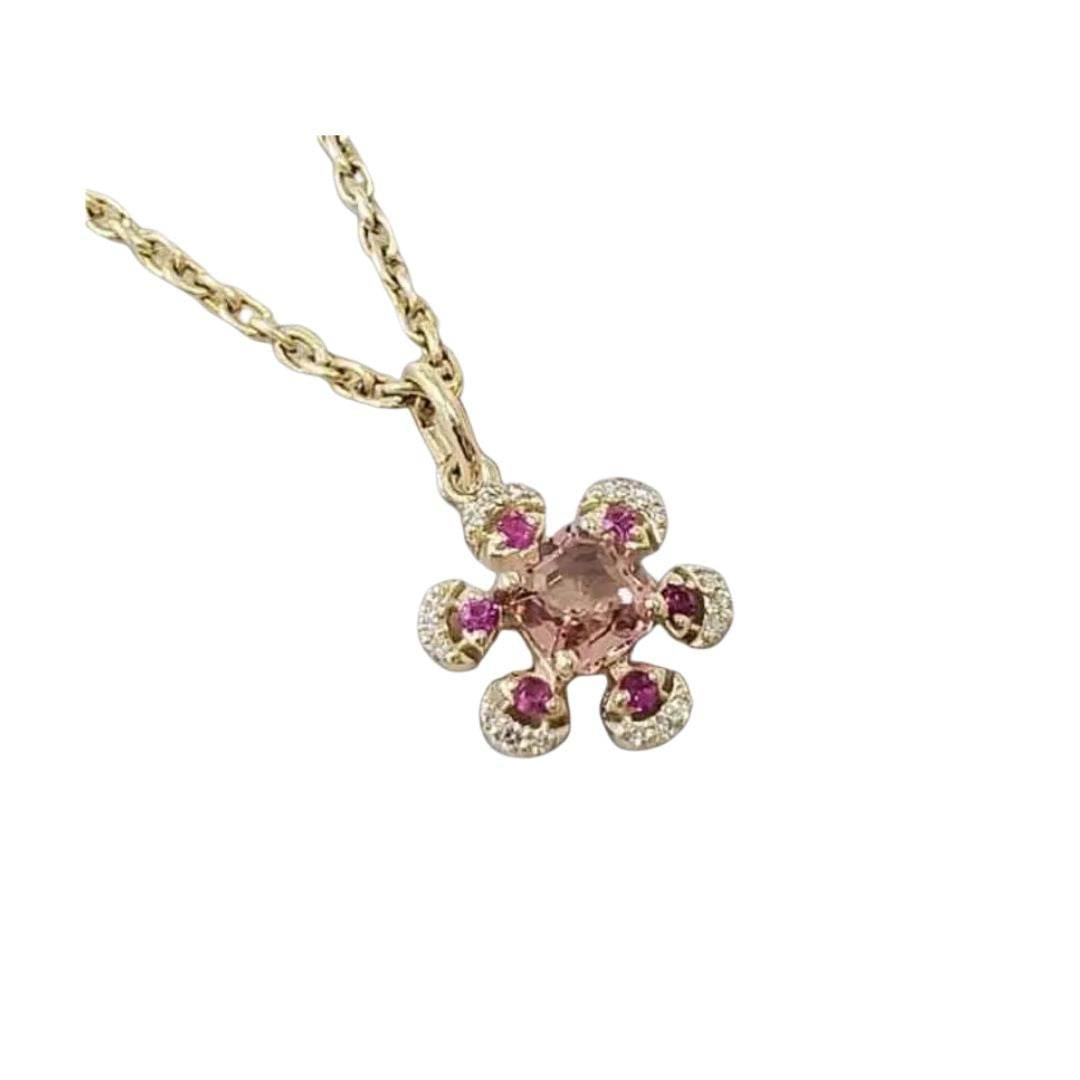 The pendant is set in 14k solid gold, weighing approximately 1.140 grams, with a total piece weight of 1.380 grams. Its warm golden glow beautifully complements the pink and red tones of the gemstones, creating a harmonious balance between boldness and delicacy.