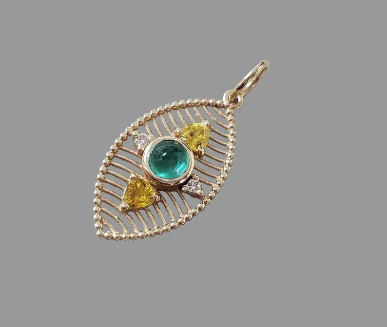 Add vibrant charm and timeless sophistication to your jewelry collection with this beautiful 14K Gold Emerald Cabochon Pendant with Yellow Sapphire & Diamond. Designed for women who love colorful gemstone jewelry, this pendant features a stunning combination of natural emerald, yellow sapphire, and diamond. The elegant framework design creates a modern yet timeless look, making this 14K Gold Emerald Cabochon Pendant with Yellow Sapphire & Diamond perfect for everyday luxury and special occasions.