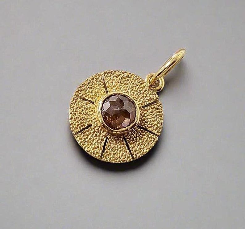 Add a touch of understated luxury to your jewelry collection with this 14k Gold Brown Diamond Medallion Necklace. This beautifully handcrafted pendant features a textured gold medallion design centered with a natural round brown diamond, creating a subtle yet sophisticated sparkle.