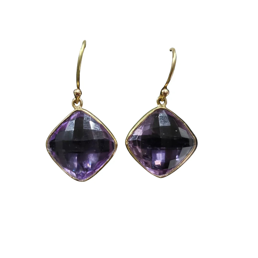 Experience the charm of regal sophistication with our 14k Gold Amethyst Earrings: Checker Cut Cushion Gemstone, designed for women who love statement elegance and fine gemstone jewelry. These stunning earrings feature natural amethyst gemstones in a cushion checker cut, known for their deep purple glow and luxurious sparkle. The faceted surface reflects light beautifully, creating a vibrant and captivating look that enhances your confidence and style.