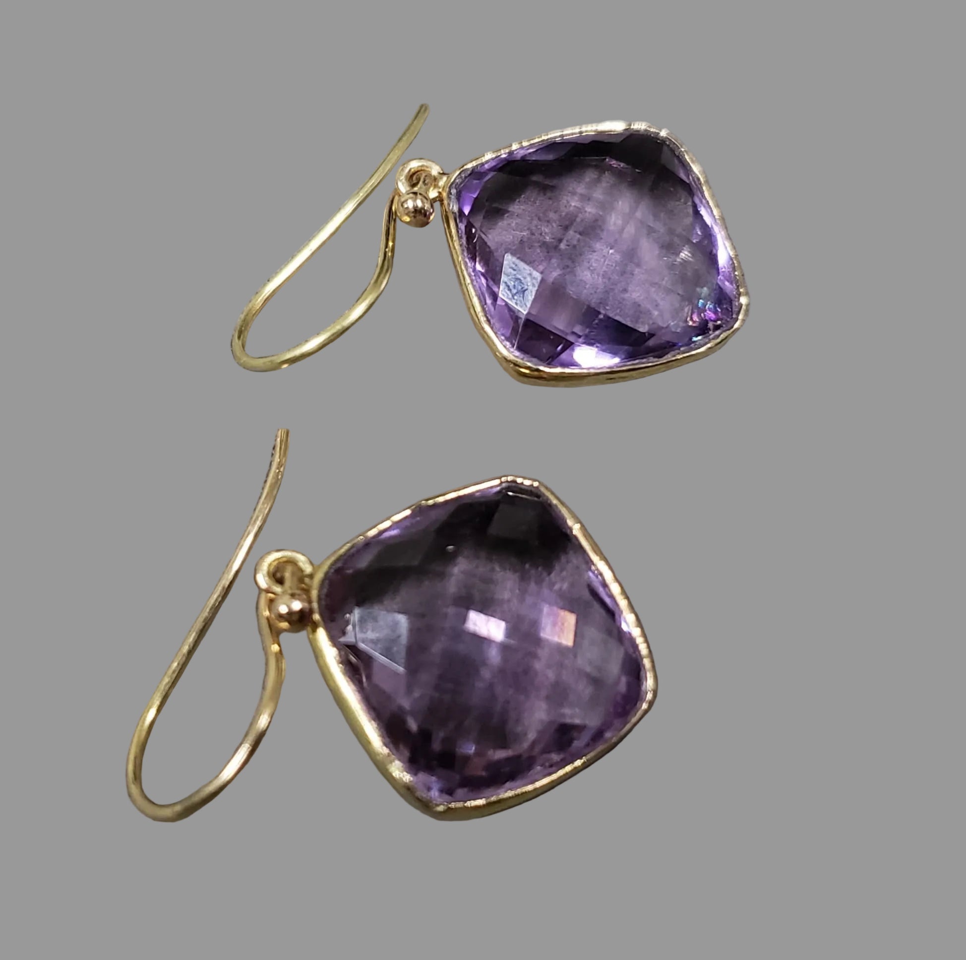 💜 14k Gold Amethyst Earrings – Checker Cut Cushion Gemstone