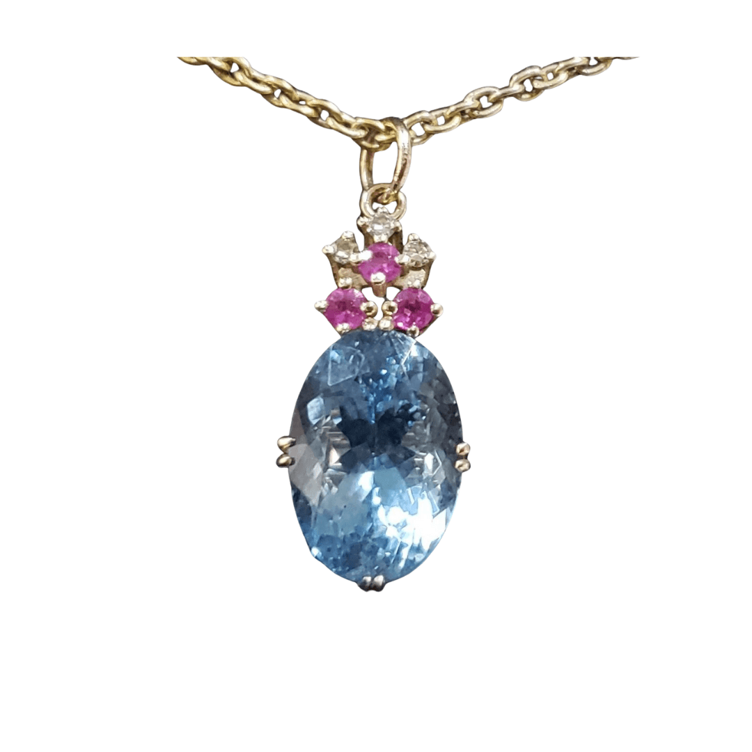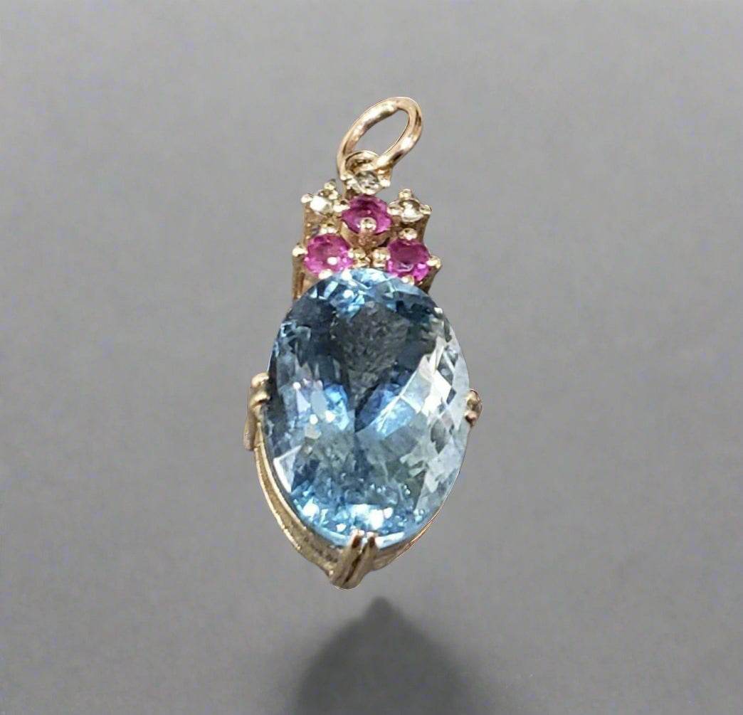 Blue Aquamarine with Ruby and Diamond 14k Gold Pendant