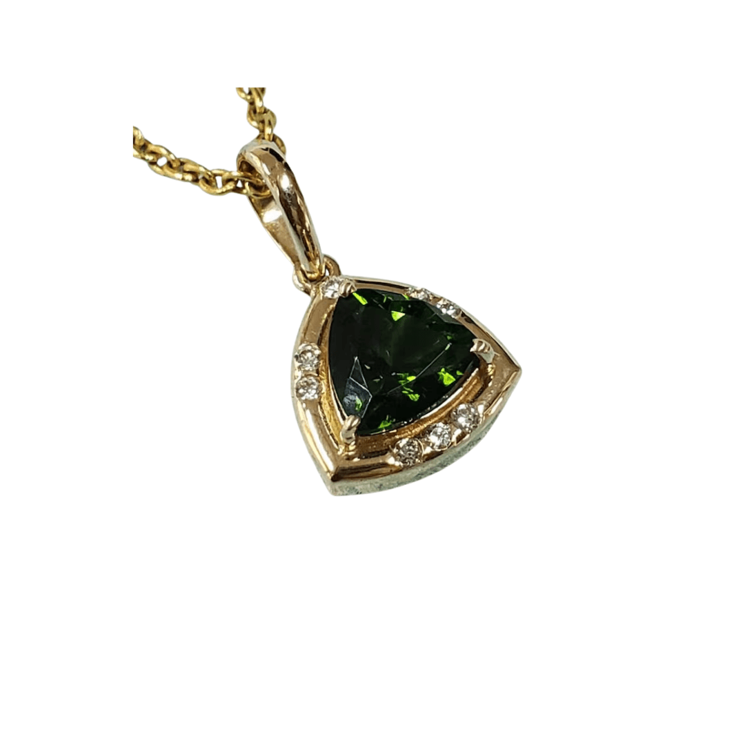 This pendant showcases a natural trillion-cut green tourmaline weighing 2.20 carats. The gemstone’s teal-green brilliance reflects sophistication, while the 0.18 carat diamond adds sparkle and charm. With a stone size of 8.50 x 8.50 MM, this unique cut enhances the pendant’s modern and bold appeal.