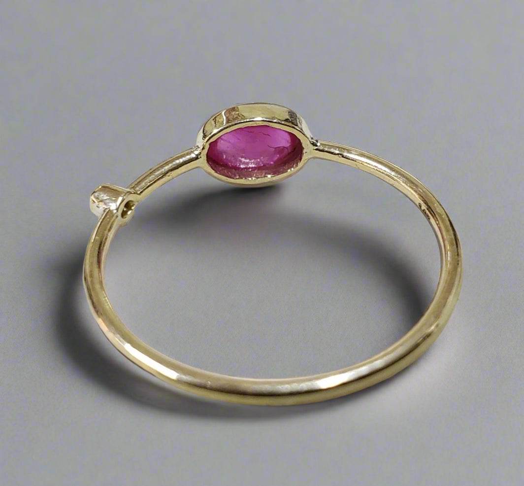The Ruby Cabochon 14k Gold Ring is a stunning piece of handmade jewelry that combines timeless charm with modern elegance. Featuring a natural ruby gemstone, accented with a delicate diamond, and set in 14k solid gold, this stackable ring is perfect for everyday wear or as a meaningful gift.