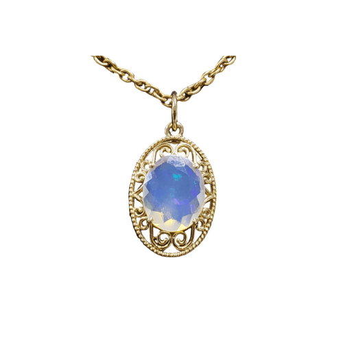 The pendant features a delicate filigree design around an oval-cut Ethiopian opal, combining vintage-inspired metalwork with modern durability. Each pendant is handmade and finished to a polished shine, highlighting the opal’s play-of-color.