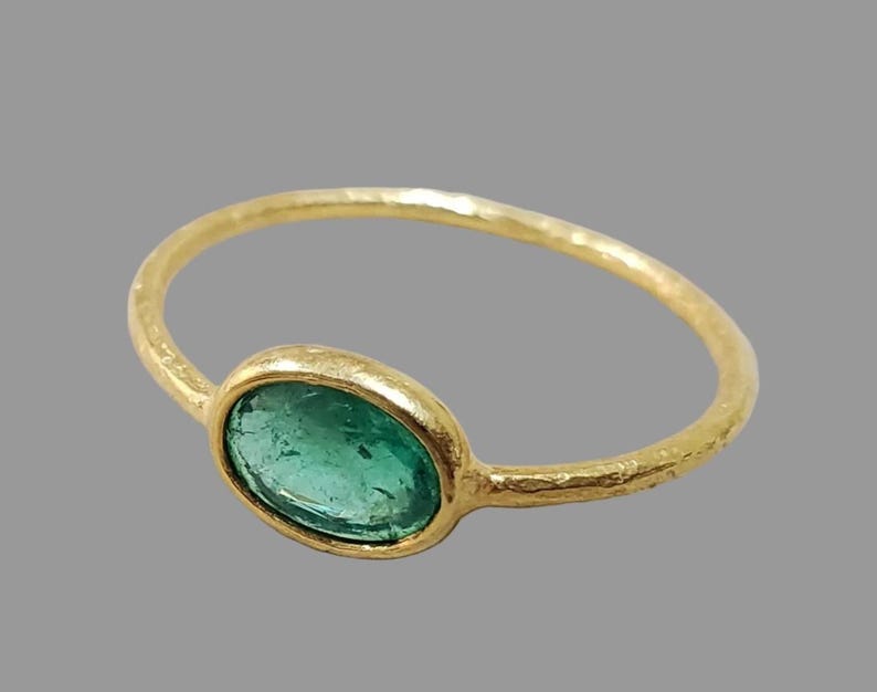 This Zambian Emerald Ring is perfect for those who appreciate natural gemstone beauty and minimalist design. The oval emerald creates a vibrant focal point, while the slim gold band offers a delicate and elegant look.