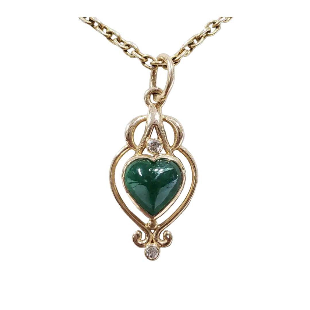 Experience timeless beauty with our Emerald & Diamond Pendant 14k Gold | Heart-Shaped Cabochon Emerald Necklace, a piece that captures the essence of elegance and love. Handcrafted with precision, this pendant features a vivid green Zambian emerald in a romantic heart shape, paired with a subtle sparkle of natural diamond — all set in solid 14k yellow gold.