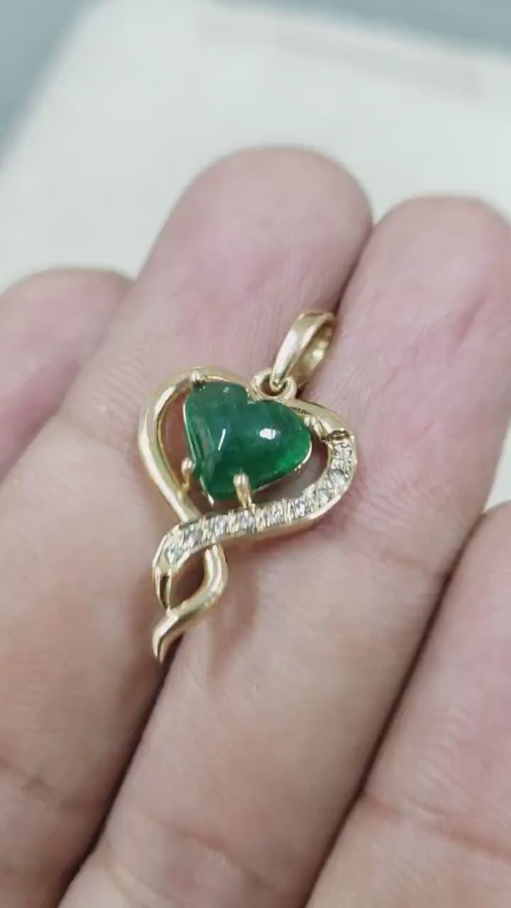 Emerald & Diamond Pendant 14k Gold | Heart-Shaped Cabochon Emerald Necklace