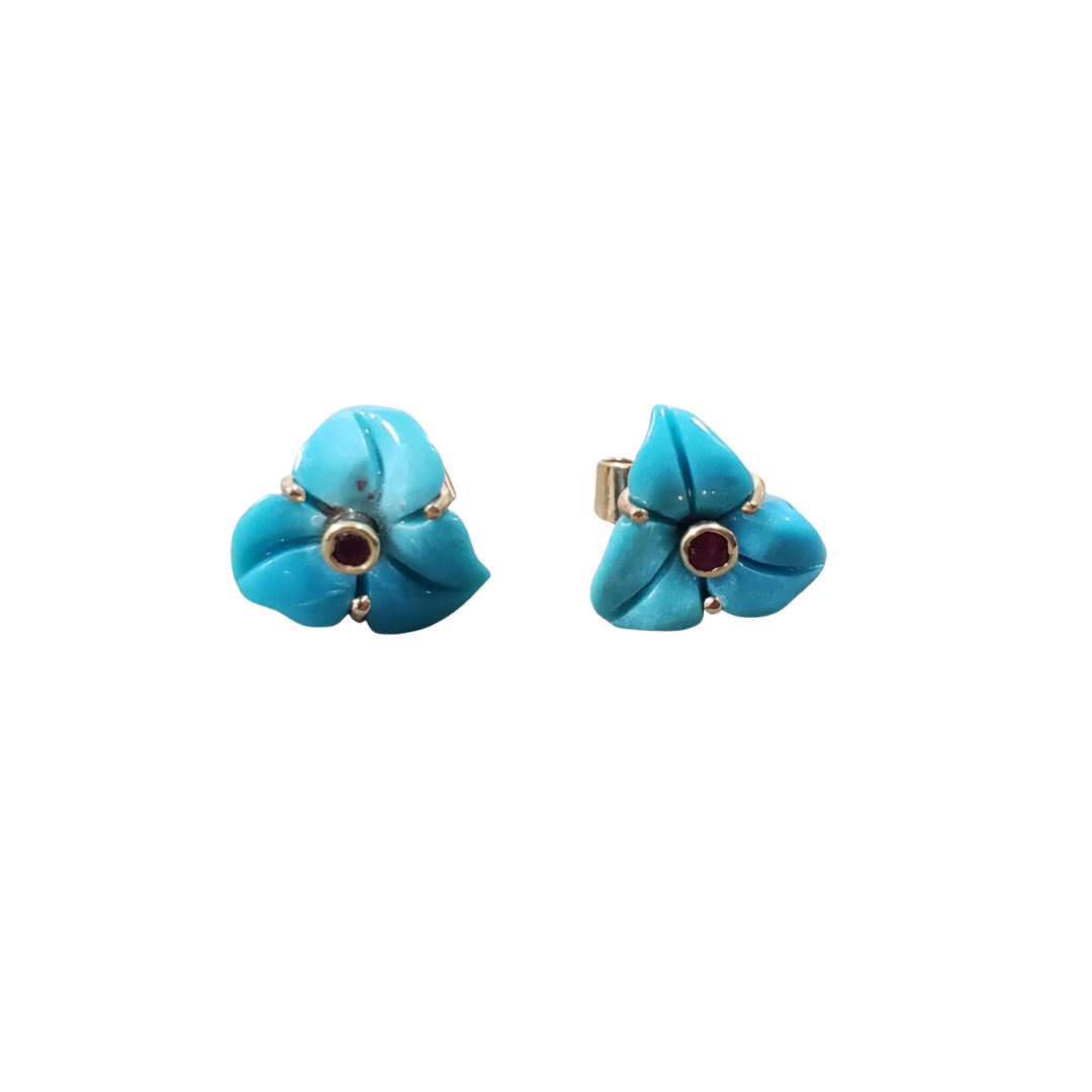 Celebrate the charm of nature with our 14k Gold Arizona Turquoise Flower Studs: Sleeping Beauty Earrings, designed for women who love unique, artistic, and meaningful gemstone jewelry. These delicate floral earrings feature hand-carved Sleeping Beauty Arizona turquoise, admired for its vibrant sky-blue color and smooth texture. Accented with a touch of ruby, these earrings combine freshness, warmth, and luxury in a timeless design.