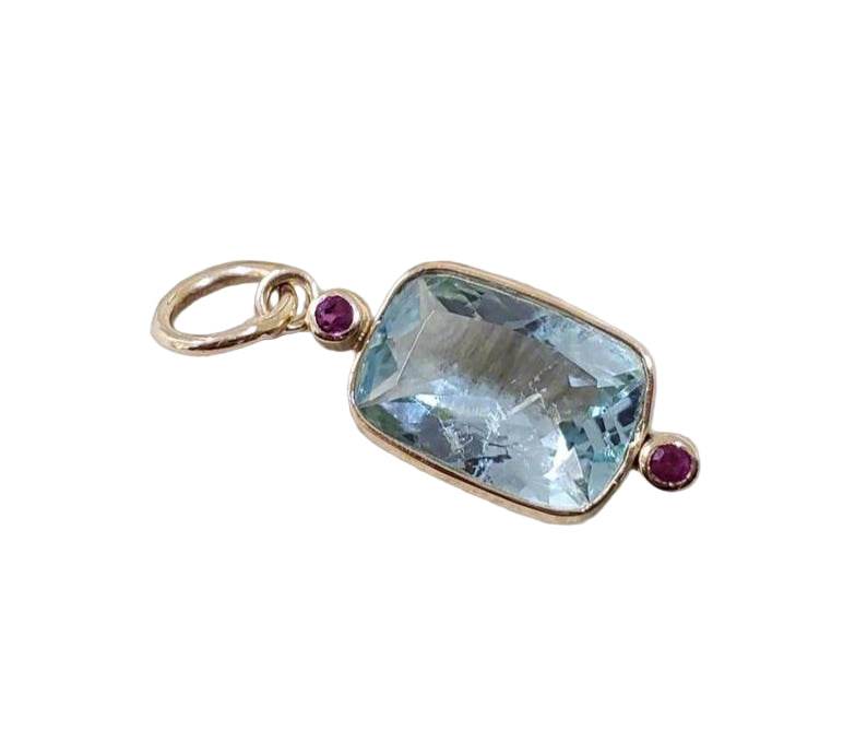 Pendentif paon classique en or 14 carats serti d'aigue-marine et de rubis