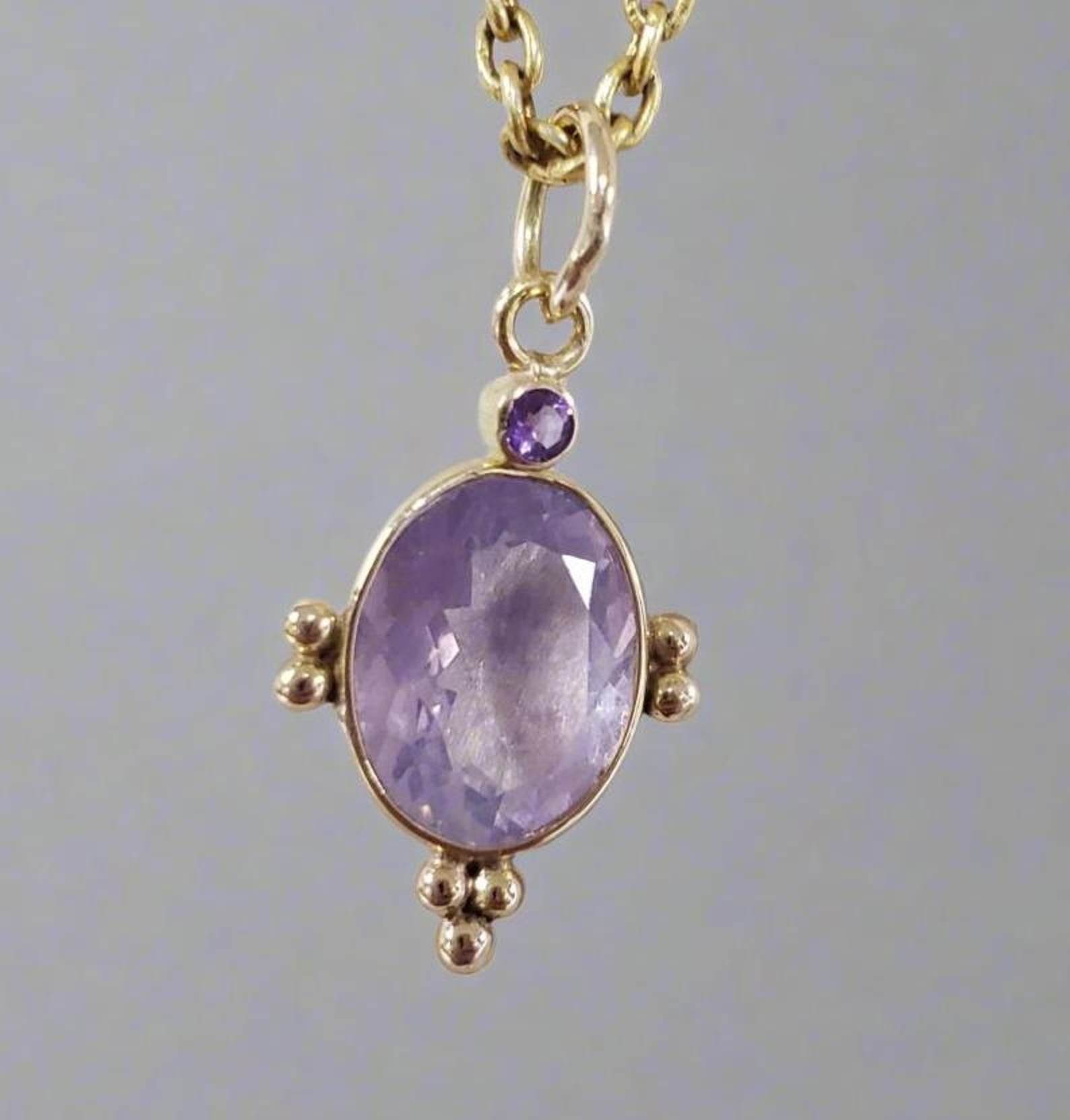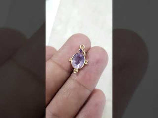This Rose De France pendant is designed with a delicate lavender quartz centerpiece framed by gold granules and accented with amethyst. The teardrop-inspired design makes it versatile enough for both everyday wear and special occasions. The 6 mm bail size allows pairing with most chains, offering styling flexibility.