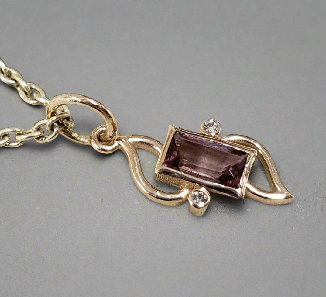 Discover refined elegance with our Baguette Pink Tourmaline and Diamond Gold Pendant, a handcrafted masterpiece designed for women who appreciate timeless jewelry. This exquisite pendant combines the soft pink hues of natural tourmaline with the radiant sparkle of diamonds, all set in lustrous 14k solid gold.
