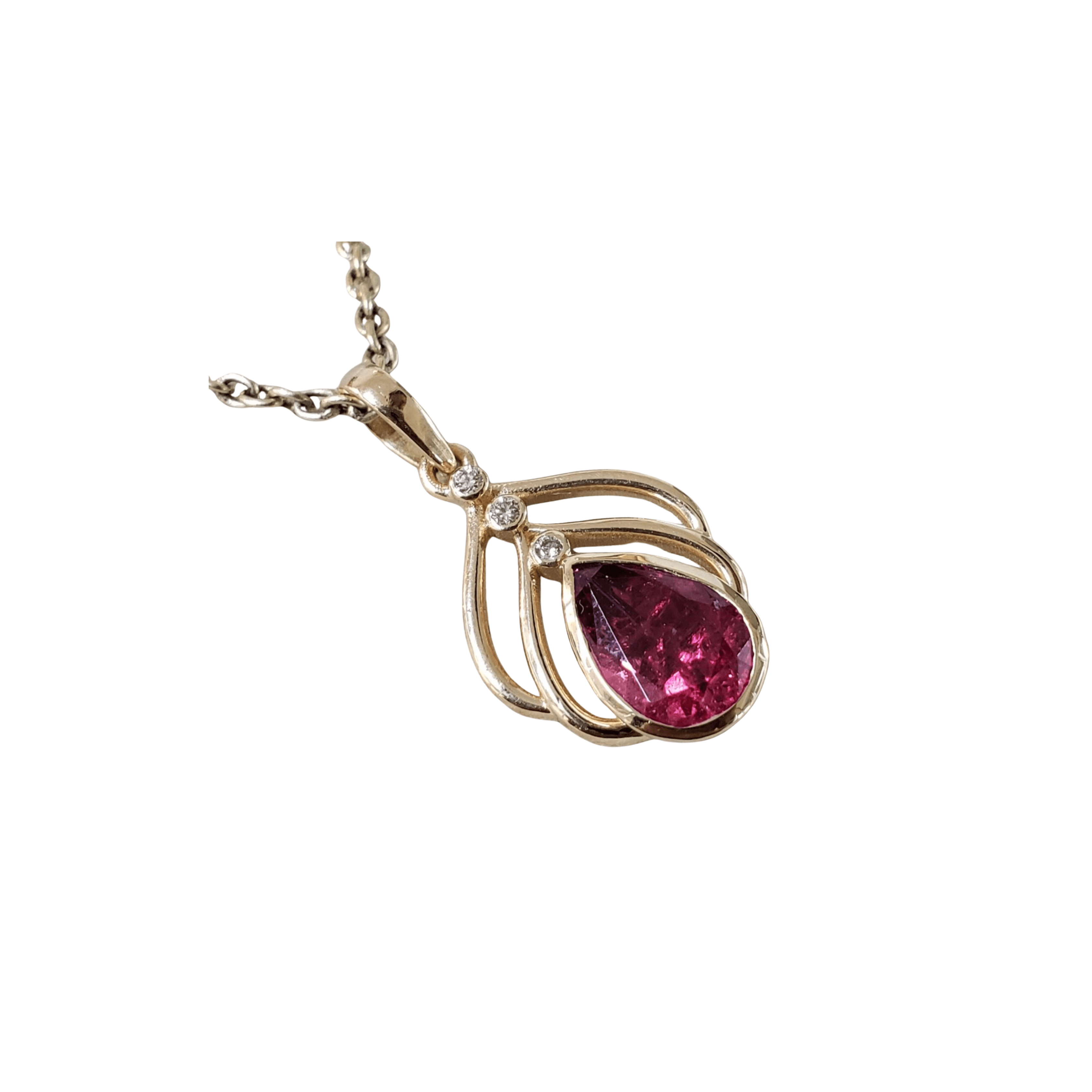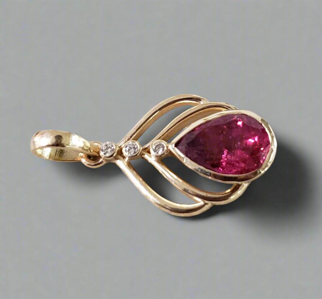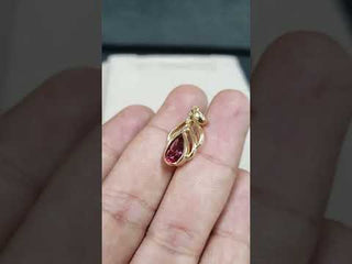 This 14k Gold Natural Rubellite and Diamond Pendant is a captivating piece of fine jewelry, blending vibrant gemstones with timeless craftsmanship. Featuring a richly colored pear-shaped rubellite tourmaline weighing 2.65 carats, accented with 0.05 carats of sparkling diamonds, this pendant is designed for women who value elegance and exclusivity.