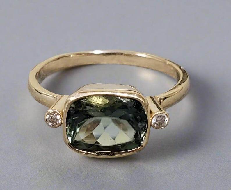 The 14k Gold Teal Tourmaline Ring is a stunning statement piece that combines the natural beauty of teal green tourmaline with a cushion-cut diamond accent. Handmade with precision, this ring is designed for those who appreciate bold, elegant, and timeless jewelry. Its unique sideways setting adds a contemporary twist while ensuring maximum sparkle and visual impact.