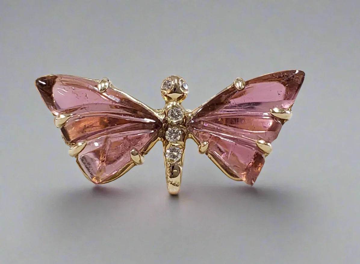 Delicate. Radiant. Meaningful. This handcrafted pink tourmaline diamond ring isn't just a piece of jewelry — it’s a symbol of hope, transformation, and love. Featuring a beautifully hand-carved butterfly motif in natural pink tourmaline and accented with glimmering diamonds, this ring brings elegance and symbolism together in perfect harmony.